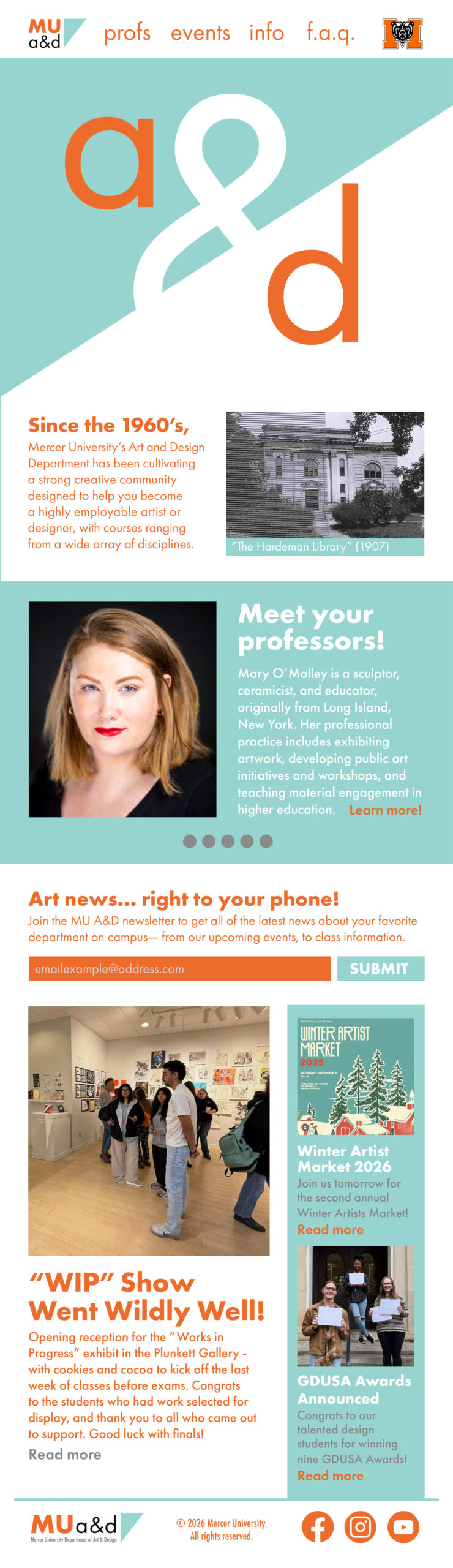 During the course GRA 310: Interactive Design, I created a newsletter design for the Mercer University Art & Design department using interactive PDFs in Adobe InDesign. This assignment allowed me to continue developing my skills in web design through various platforms (in this case, mobile) and learn how to produce effective interactive PDFs. This design is currently in contention for use within the department.